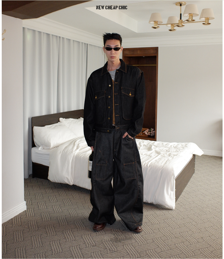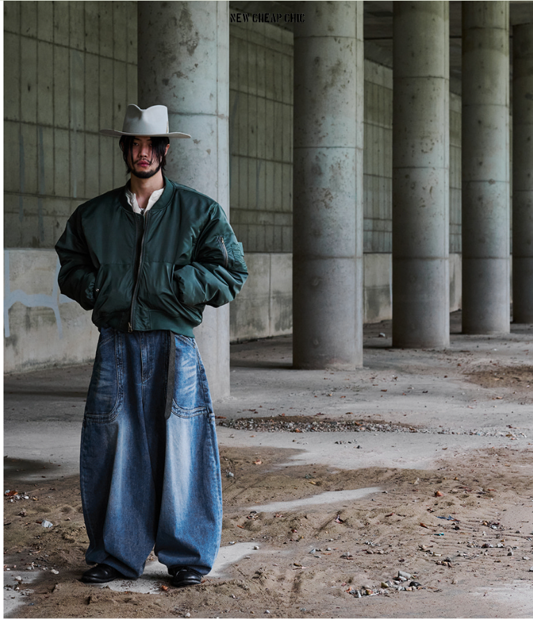 청 특유의 묵직한 원단감이 실루엣을 잡아주면서 흘러내리는 느낌. 상체에 레더 재킷이나 오버사이즈 아우터를 올리면 상하체 볼륨이 균형을 맞추면서 테토 무드가 완성된다.