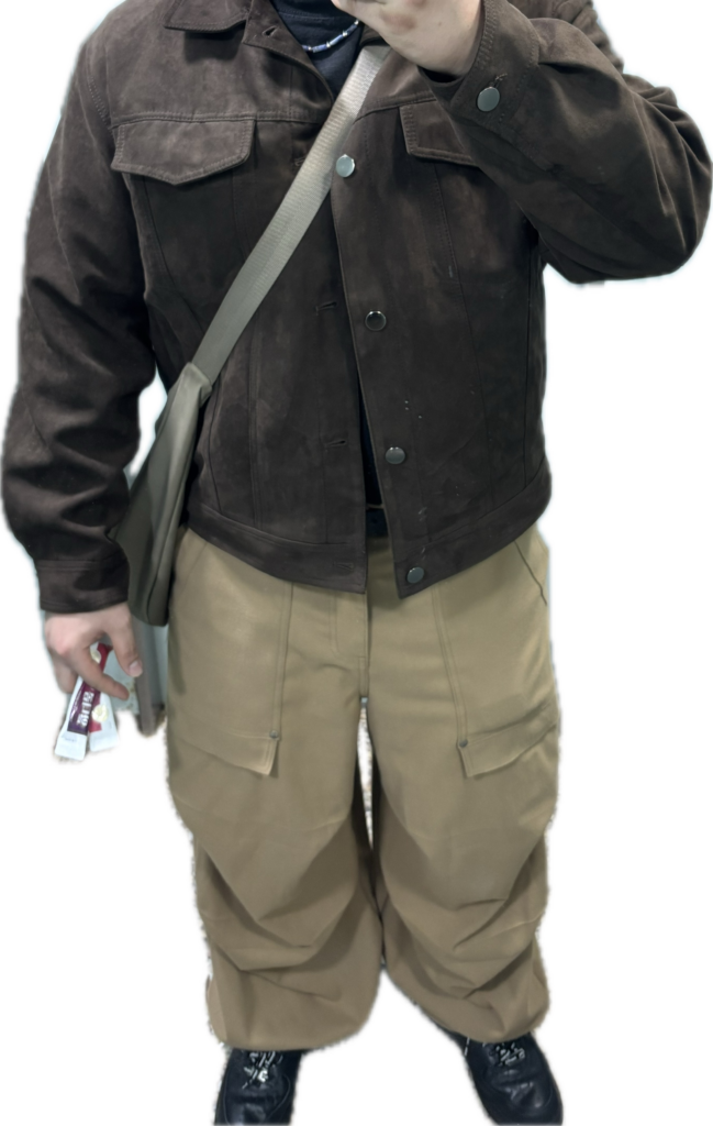 스웨이드 트윌 소재라 일반 면 팬츠와 결이 다르다. 표면이 살짝 보풀거리는 질감인데, 이게 빛을 받으면 색감이 달라 보인다. 브라운 컬러가 단순한 갈색이 아니라 깊이감 있게 보이는 이유다.