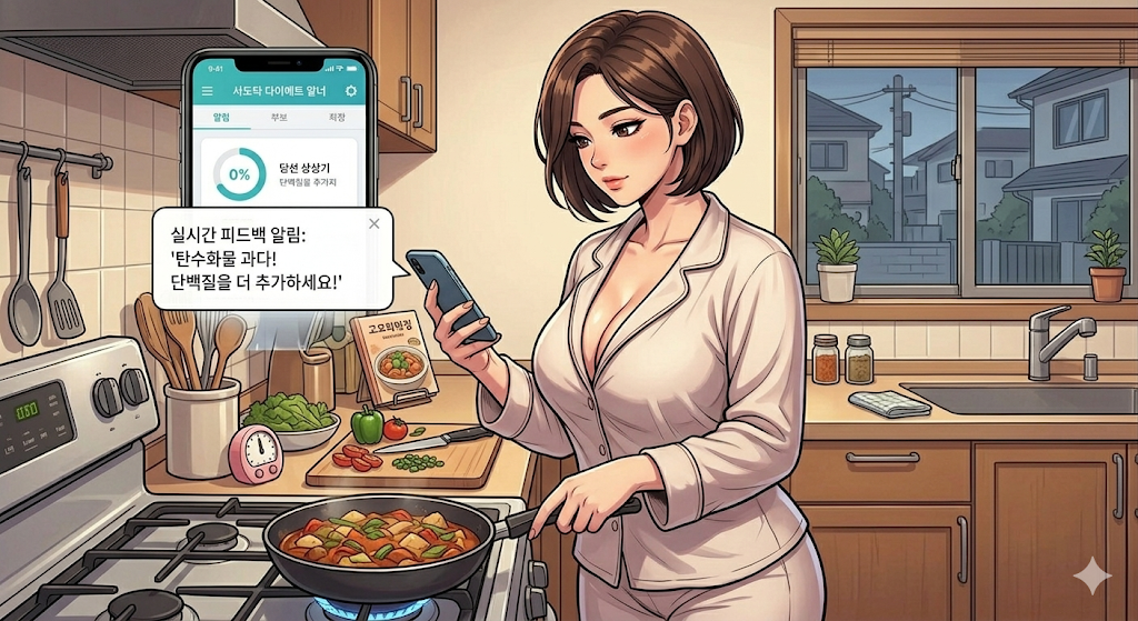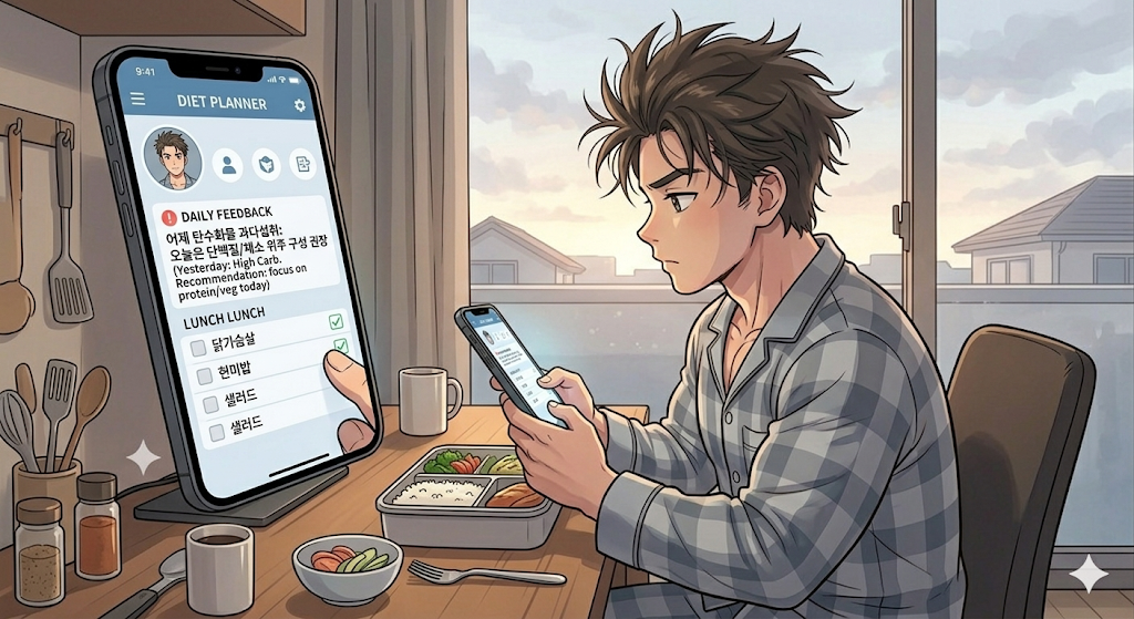 작동 방식은 이렇다. 사용자가 식사를 입력할 때마다 시스템은 현재까지의 누적 섭취량을 목표 매크로와 비교한다. 편차가 특정 임계값을 넘으면 피드백이 트리거된다.